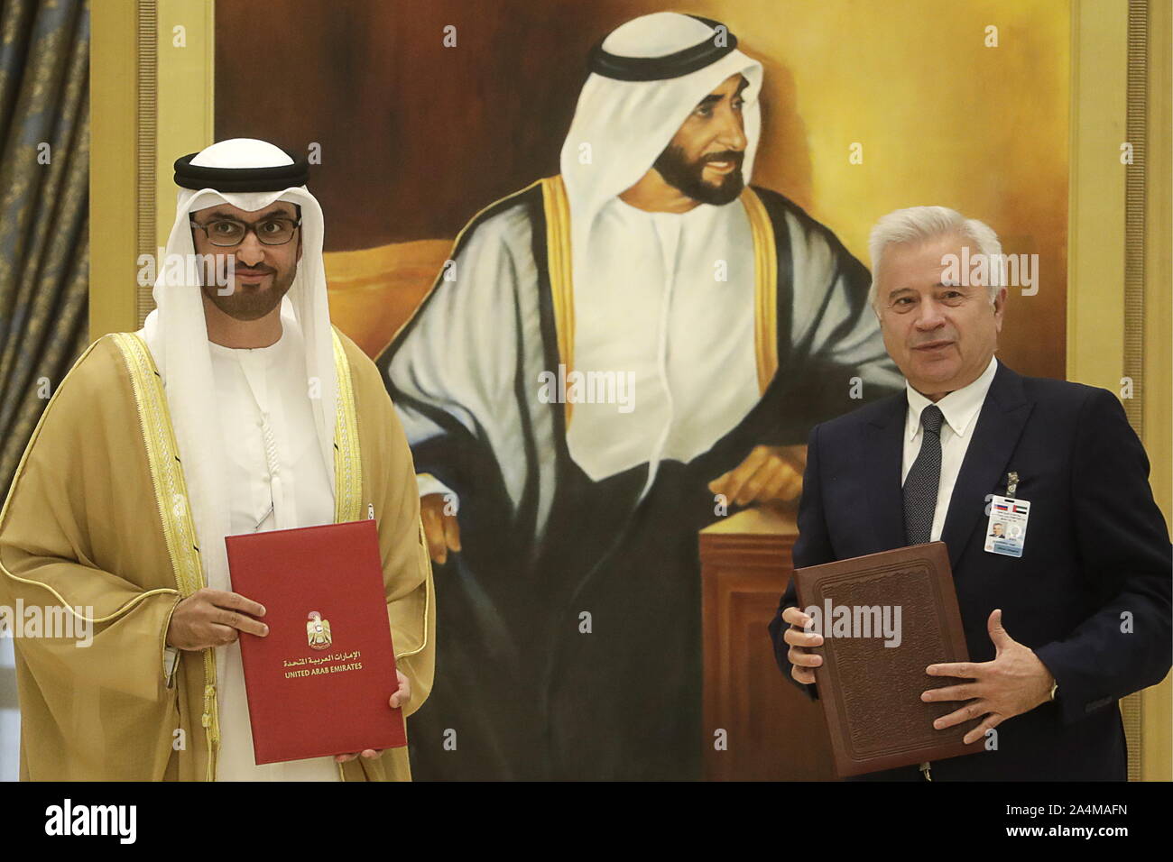 Abu Dhabi United Arab Emirates 15th Oct 2019 Abu Dhabi Uae October 15 2019 Abu Dhabi National Oil Company Ceo Sultan Ahmed Al Jaber L And Lukoil President Vagit Alekperov Sign
